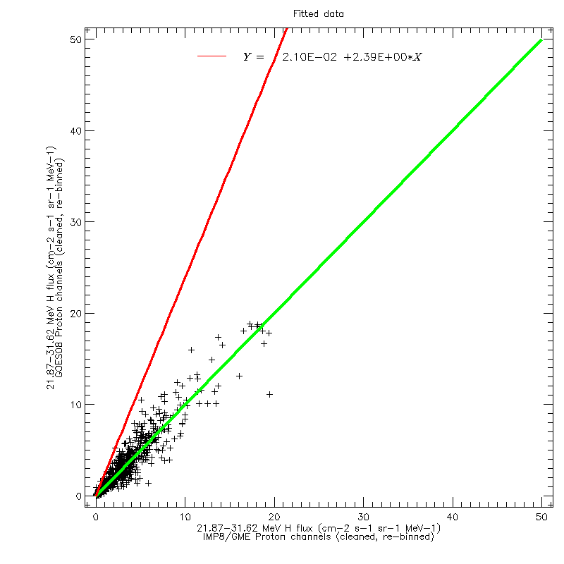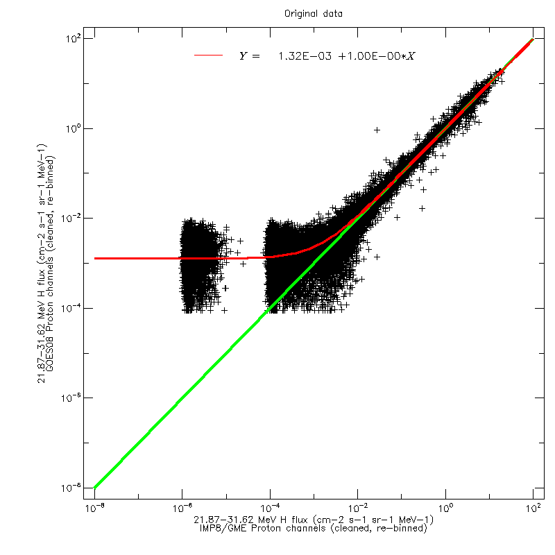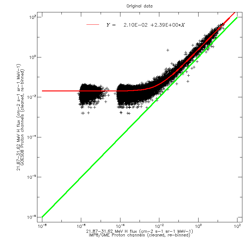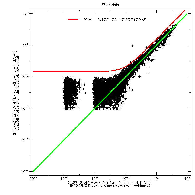 For each of the four GOES datasets, and for each of the ten reference energy channels, linear regression fits were calculated to scatter plots of the GOES and GME data (after re-binning in energy). The figures below show the scatter plot for the 21.87–31.62 MeV channel, using GOES08 data, on a linear and logarithmic scale, respectively. The regression fit was calculated using the original values, not the logarithms.