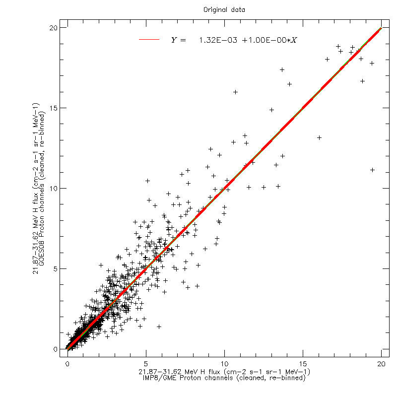 For each data channel, the inverse regression fit was then applied to the GOES data, to align them with the GME data. The figures below show the data of the two above figures after applying the inverse fit. After applying the cross-calibration, the data are now scattered around the line of equality.