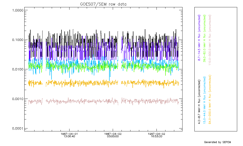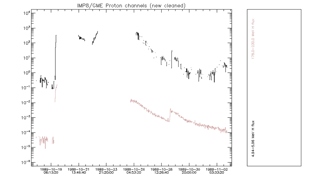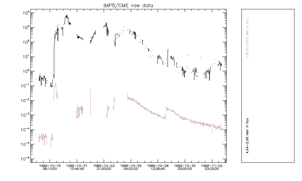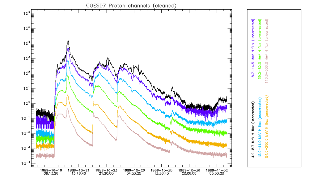 As an illustration, the figure below shows the GOES07/SEM proton data during the Oct 89 event.