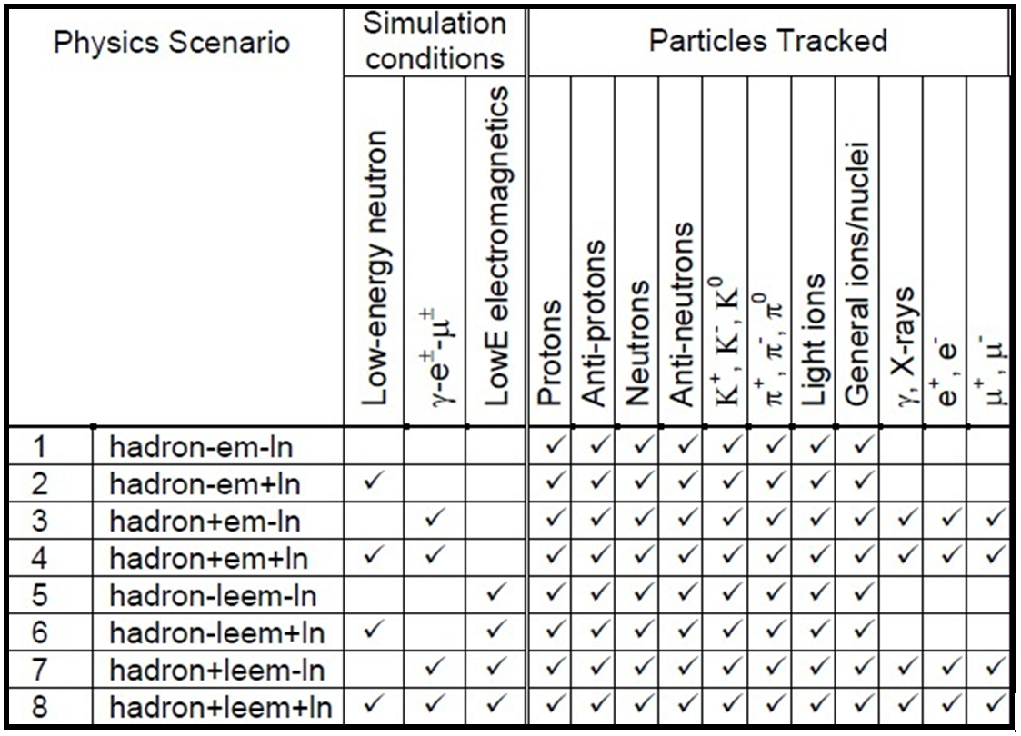 In SEPEM both tools can be applied by users with no programming experience and very little knowledge of Geant4 itself. SEPEM users only have to define the data table, the particle species, the device geometry and the device material(s). Appopriate physics lists are selected by the SEPEM software from the table below, depending on the type of simulation.